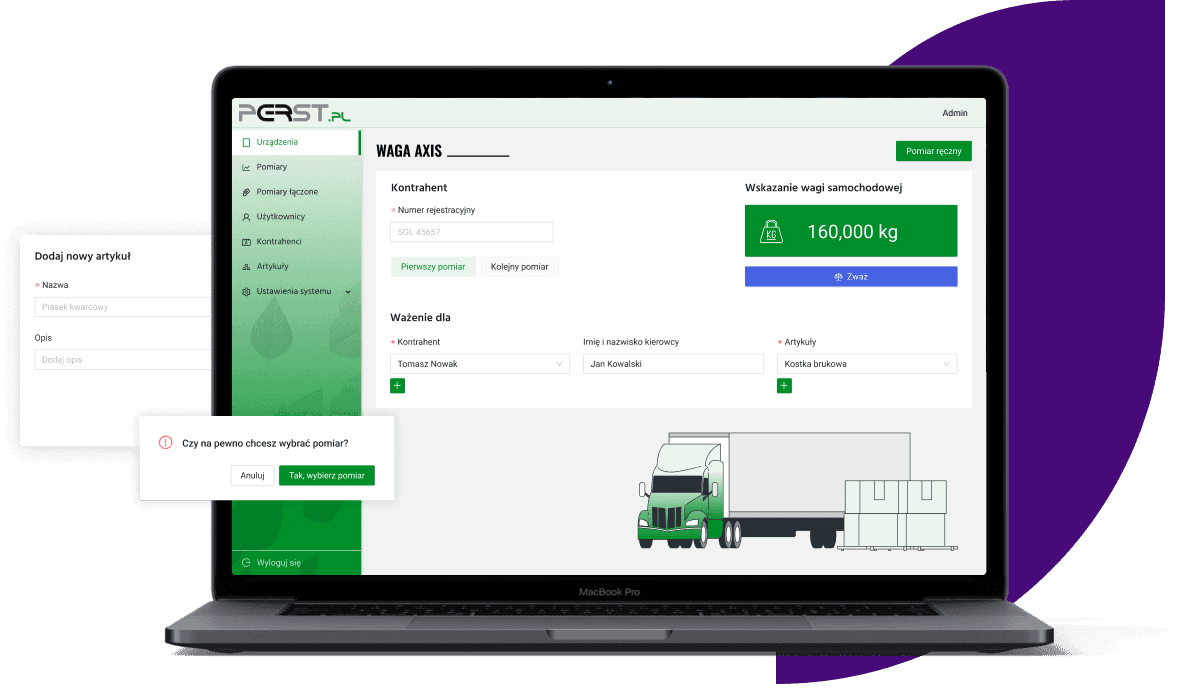 The app offers a wide range of functionalities, such as managing scales, taking measurements, managing a list of clients, and products. Depending on their permissions (administrator or operator), users have various capabilities within the system. Perst allows for continuous or on-demand data collection and for generating reports in CSV or PDF formats. The client also expressed a need to combine various measurement results to determine the difference between them; thus, we extended the tool with a net weight calculation feature.